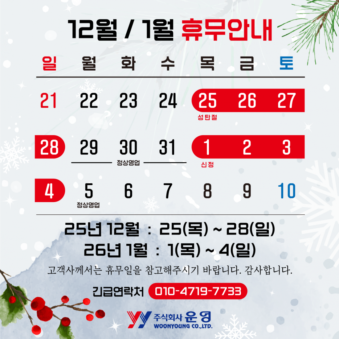 2025년 12월, 2026년 1월 휴무안내