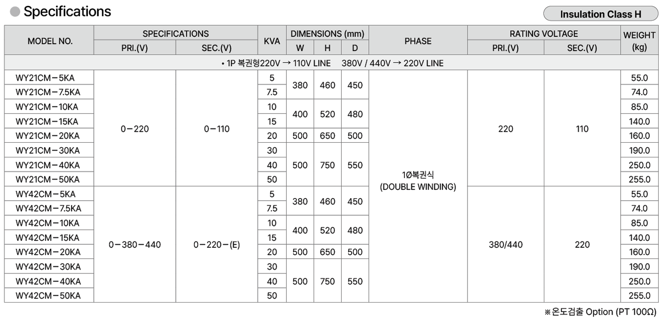 단상, 복권형으로 일반 Dry Type으로 Casing화 하여 전면에는Lamp,계측기, NFB 등을 부착하였으며