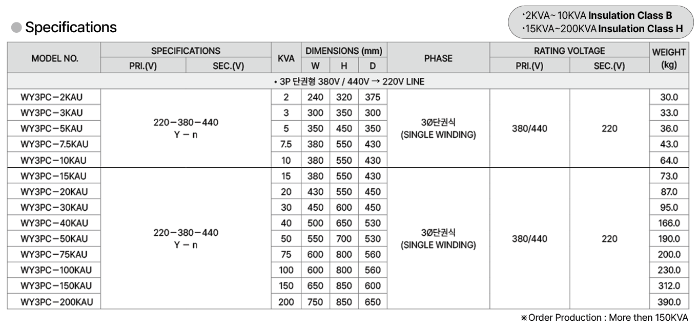 | Model No | WY3PC-2KAU WY3PC-3KAU WY3PC-5KAU WY3PC-7.5KAU WY3PC-10KAU WY3PC-15KAU WY3PC-20KAU WY3PC-30KAU WY3PC-40KAU WY3PC-50KAU WY3PC-75KAU WY3PC-100KAU WY3PC-150KAU WY3PC-200KAU |