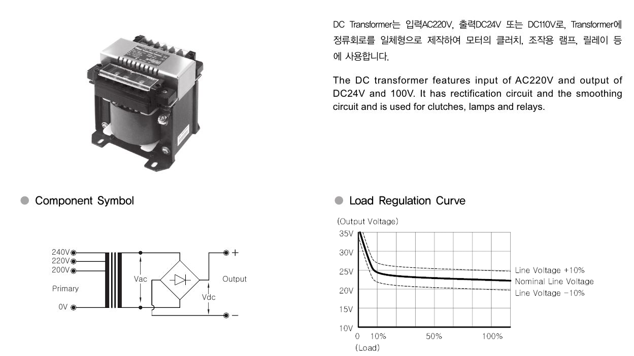 The DC transformer features input of AC220V and output of DC24V and 100V. It has rectification circuit and the smoothing circuit and is used for clutches, lamps and relays.