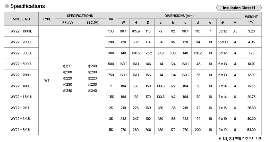 | Model No | WY22-100UL WY22-200UL WY22-300UL WY22-500UL WY22-750UL WY22-1KUL WY22-1.5KUL WY22-2KUL WY22-3KUL WY22-5KUL |