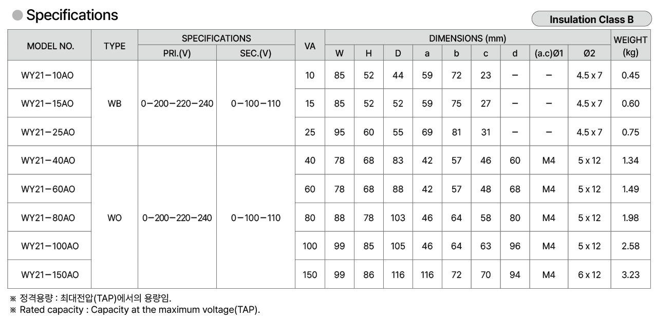 | Model No | WY21-10AO WY21-25AO WY21-40AO WY21-60AO WY21-80AO WY21-100AO WY21-150AO |