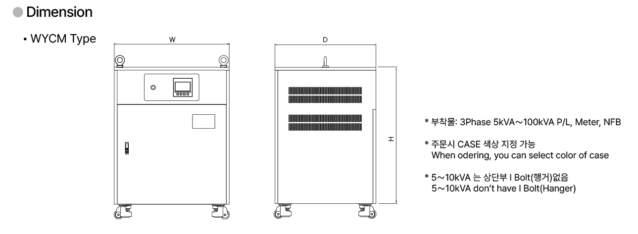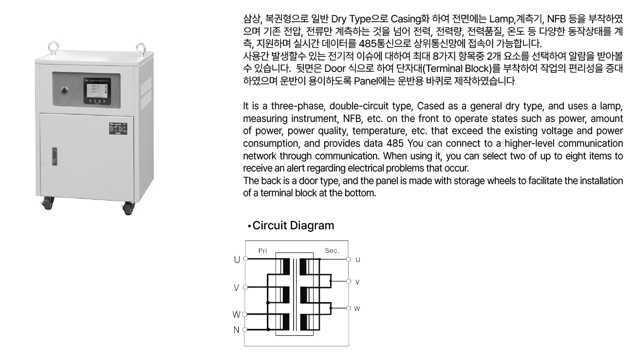 삼상, 복권형으로 일반 Dry Type으로 Casing화 하여 전면에는 Lamp,계측기, NFB 등을 부착하였으며