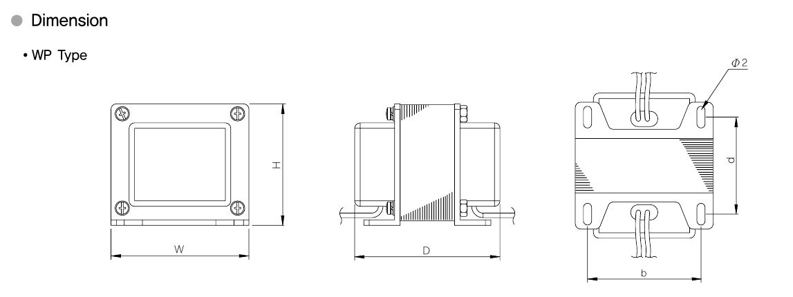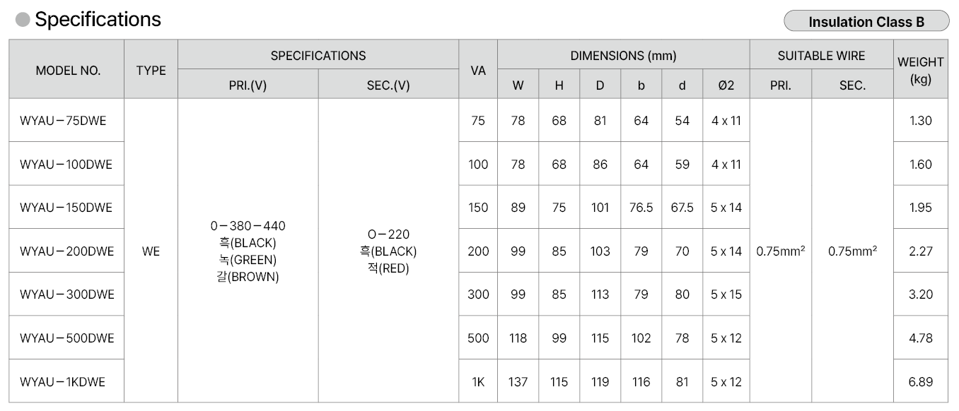 단상 단권형으로 입력 AC380/440V 출력 AC 220V로 Lead-Wire로 제작되었으며