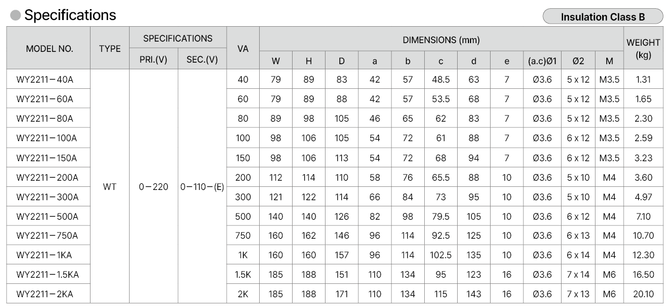| Model No | WY2211-40A WY2211-60A WY2211-80A WY2211-100A WY2211-150A WY2211-200A WY2211-300A WY2211-500A WY2211-750A WY2211-1KA WY2211-1.5KA WY2211-2KA |