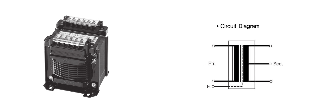 단상 복권형으로 AC 110/220V 이며 출력은 AC 24/36V, 25/50V 로 40VA부터 2KVA까지 규격화 하였습니다.