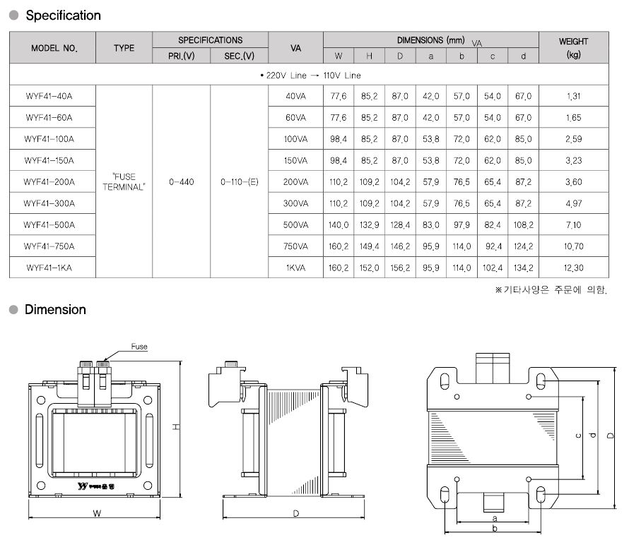 | TYPE | 단상 복권형 AC FUSE형 트랜스포머 |