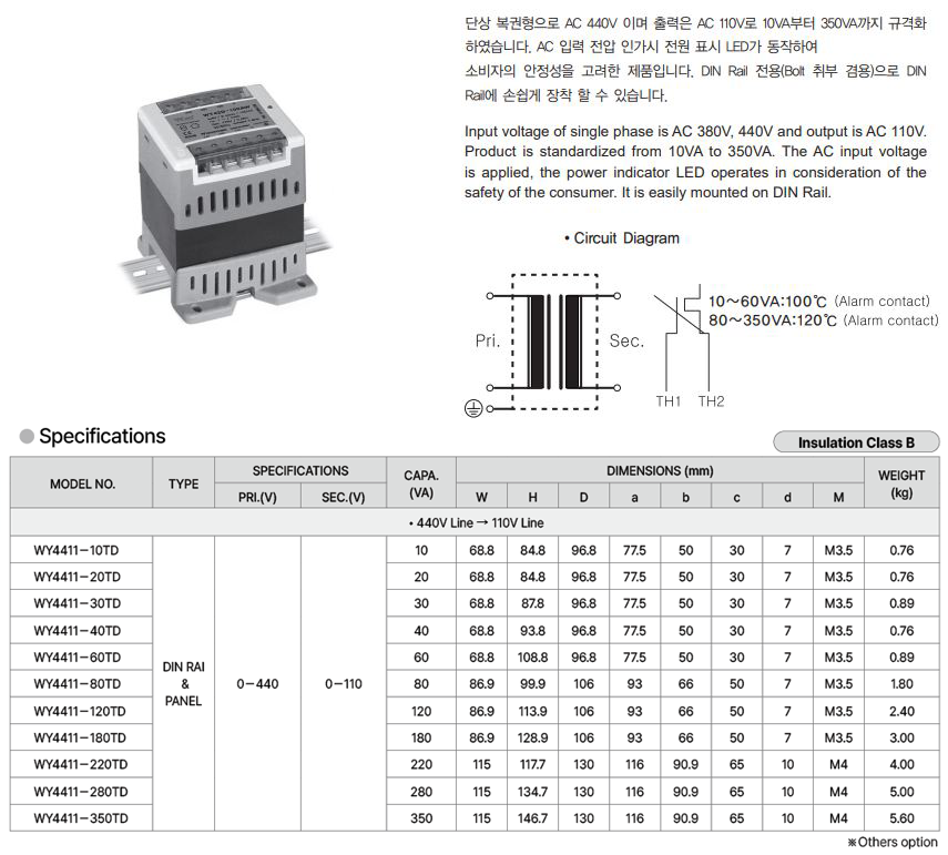 단상 복권형으로 AC 440V 이며 출력은 AC 110V로 10VA부터 350VA까지 규격화 하였습니다.